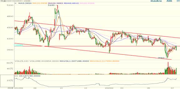 JD2009合约多次试探4000一线未果,今日大幅增仓下挫。今日鸡蛋现货市场价格普涨,鸡蛋市场期、现货价格走势背离,主要源自预期与现实的偏差,盘面高升水已经注入了季节性上涨预期,但鸡蛋市场供需偏宽松的格局短期内暂难缓解,叠加极端天气影响,现货市场反弹幅度或不及预期,令期货市场上冲信心减弱。目前南方高温高湿及暴雨天气影响鸡蛋的储存及运输,制约短期蛋价走势,而后市季节性旺季支撑,鸡蛋现货市场价格将呈现稳中回暖态势。供需预期来看,6月在产蛋鸡存栏环比下跌2.98%,高温背景下产蛋率下降,未来产蛋高峰期蛋鸡占比将有所下降,但鉴于时待淘适龄老鸡不多,整体供应充裕,随着传统的消费旺季来临,将支撑鸡蛋市场价格触底反弹,而反弹高度也将受到去产能进程缓慢的压制,或不及往年同期水平,且节日效应消退后鸡蛋市场价格仍面临阶段回调风险,相反若超淘或出货加快,则有望提振鸡蛋市场提前走出低谷期。期货市场来看,主力2009合约升水较高,基差修复阶段,期货市场仍有回调风险,背靠4000附近空单设置保护持有,反弹试空思路参与为主,8-9正套持有,后期关注物流及老鸡淘汰进度影响。