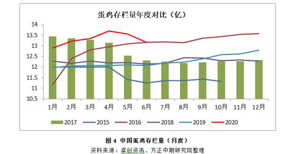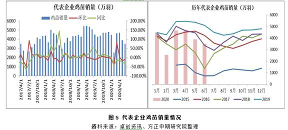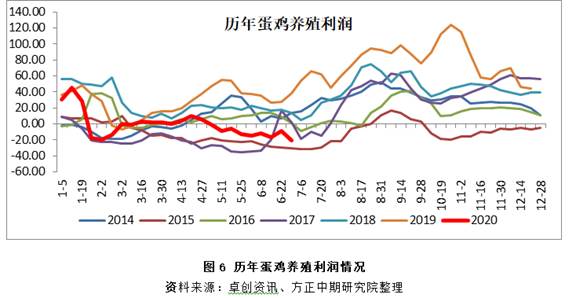 从鸡苗销量情况来看,虽然今年2月份鸡苗销量大幅减少,但1、3、4、5、6月份鸡苗销量处于正常水平,也将意味着今年下半年市场供应将趋于充裕,因近期随着鸡蛋、淘鸡价格弱势,及饲料原料成本维持坚挺,蛋鸡养殖利润亏损不断增加,打压市场补栏积极性,整体下半年养殖单位鸡苗销量预计维持低位水平,进而影响4个月之后的在产蛋鸡存栏减少,低补栏将逐步替代高存栏,支撑远月市场价格走势。