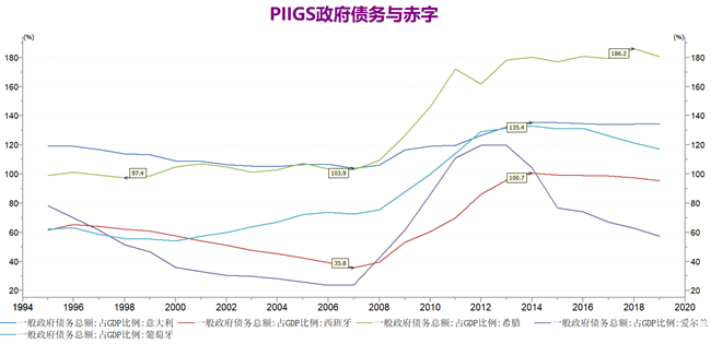 图 7 欧元区部分国家政府债务占比统计(1994-2020)