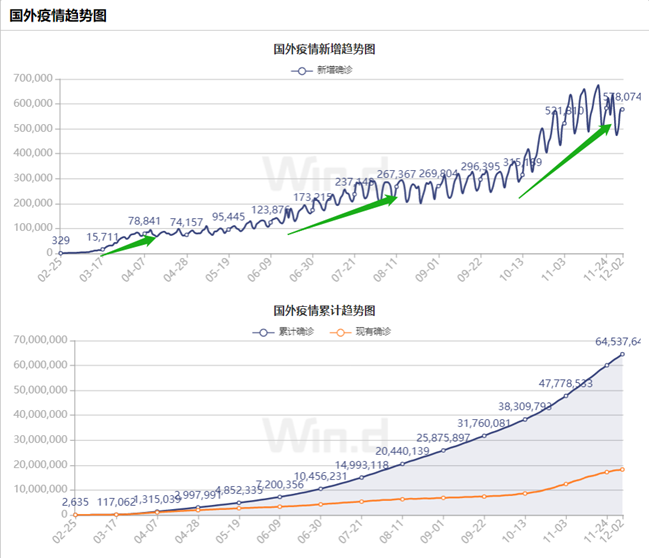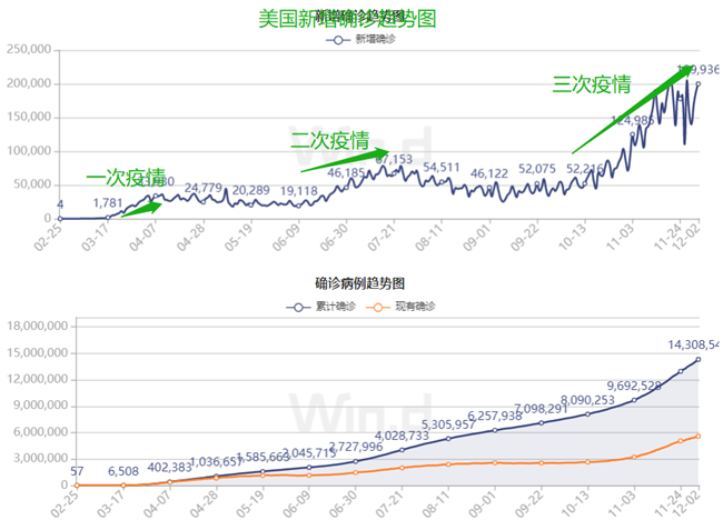 二次疫情未结束之际,三次疫情来袭。美国政府防疫的不作为,美国大选集会无视社交距离的要求以及温度下降加快疫情蔓延,10月中下旬开始,美国三次疫情来袭,新增确诊人数持续上涨,新增确诊人数在11月中下旬已经达到20万,死亡人数亦维持在1000左右;疫情虽然严重,但是处于美国大选的关键期,政府更加的不作为,任疫情自由发展,在疫苗出现前,美国疫情难以得到有效的控制。