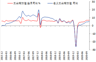 数据显示,中国1-11月规模以上工业增加值累计同比增速为2.3%符合预期,较前值1.8%继续改善;11月规模以上同业增加值同比增速为7%符合预期,也超过前值的6.9%。环比来看,季调后的11月规模以上工业增加值同比增长1.03%,比较前值有所加速。我们通过计算得到的数据显示,11月名义工业增加值同比增速5.5%,较前值4.8%再度加快。