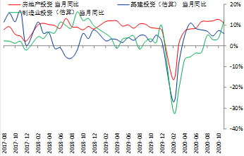 从当月角度看,三大投资分项中主要是制造业投资加速明显,但是基建投资和房地产投资均有所回落。从边际上看,房地产投资出现弱于季节性表现的问题,基建投资稍强于季节性,制造业投资则明显强于季节性。该表现与产出端以及前期公布的金融数据逻辑能够相互印证。企业扩大投资的意愿强烈,获得的流动性支持依然存在,实际增长也非常明显。另外和去年情况一样,四季度总体投资增量开始回落,可能与口径或基数调整有关。