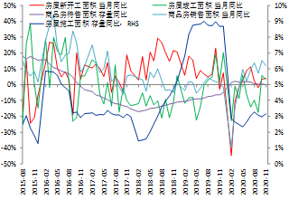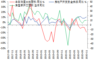 从先行指标上看,11月土地购置面积明显弱于季节性。开发资金来源总体符合季节性,其中国内贷款明显弱于季节性,并且倒逼放弃增加自筹资金超季节性。定金及预收款、个人按揭贷款符合季节性,也暗示下游销售暂时保持稳定。上述数据仍可与央行公布的金融数据交叉印证,房地产企业流动性仍受到负面影响。房地产投资承压迹象仍明显,房地产投资风险仍需要警惕。