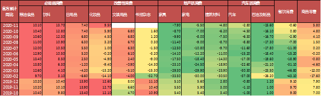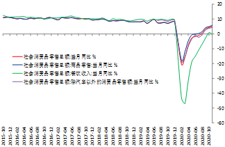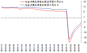 消费方面,1-11月社会消费品零售总额累计同比-4.8%,稍强于预期的-4.9%,明显强于前值-5.9%;扣除价格因素的1-11月社会消费品零售总额累计同比增速为-6.3%,强于前值-7.65%。从11月当月情况看,名义社会消费和实际社会消费同比增速分别为5%和6.17%,较前值4.3%和4.61%均有所改善。季调环比角度看,名义社消同比增长1.31%,比前终止0.72%明显加速。