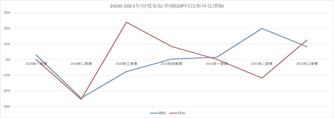 其一,同期基数太低。去年三季度和今年二季度均是印度疫情的爆发期,造成当时经济大幅萎缩,去年三季度印度实际季调GDP同比下降7.4%,今年二季度环比下降11.6%。