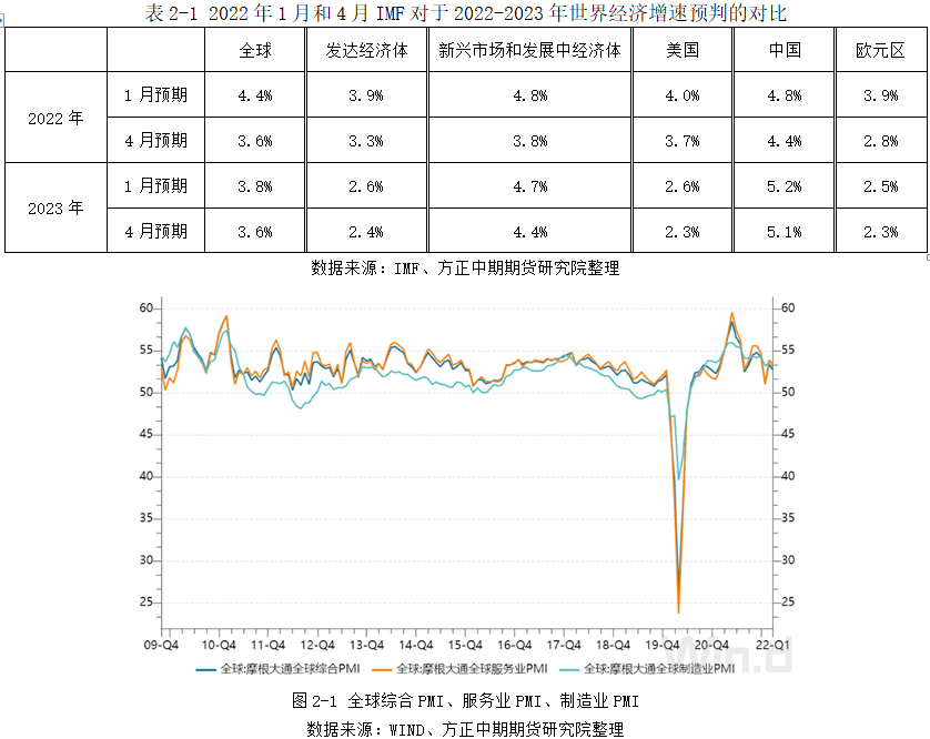 4月19日IMF在新一期发布的《全球经济展望报告》中再次下调了2022年世界经济增速预期,从1月报告中的4.4%预测值下调至3.6%,下降幅度达到0.8个百分点。而且,与1月报告中“下调2022年经济增速预期、上调2023年经济增速预期”不同,4月报告将2023年的经济增速预期也下调了0.2个百分点至3.6%。引起世界经济增速下行压力增强的原因有很多,其中主要包括俄乌冲突、制裁与反制裁、疫情重燃、通胀高企、货币政策收紧、债务危机、地缘政治、供应链危机、气候问题等原因。绝大多数问题是2021年延续下来的,部分得到了缓解,但是更多问题呈现加剧之势。根据摩根大通公布的指数可以看出,今年一季度全球综合PMI均值为52.4,仍处于扩展区间,但整体呈明显的下降态势。今年1月全球单日新增确诊病例达到历史峰值,PMI仅录得51.1;2月世界多国解除疫情完全防控措施,PMI反弹至53.4;但是随着俄乌爆发及冲突持续升级,3月PMI再度回落至52.7。
