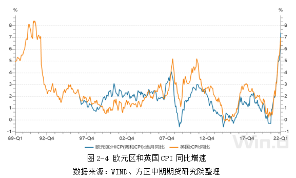 2022年3月欧元区HICP同比增速录得7.5%,环比增速录得2.5%,均创该指数1997年1月公布以来新高;同月,英国CPI同比增速录得7%,创近30年新高,前高还要追溯至1992年1月的7%;环比增速录得1.1%,创近24年新高。