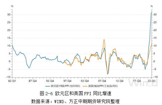 从PPI角度来看,英国3月工业品输出价格指数同比录得11.84%,创近13年新高;2月欧元区录得31.4%,创历史新高。