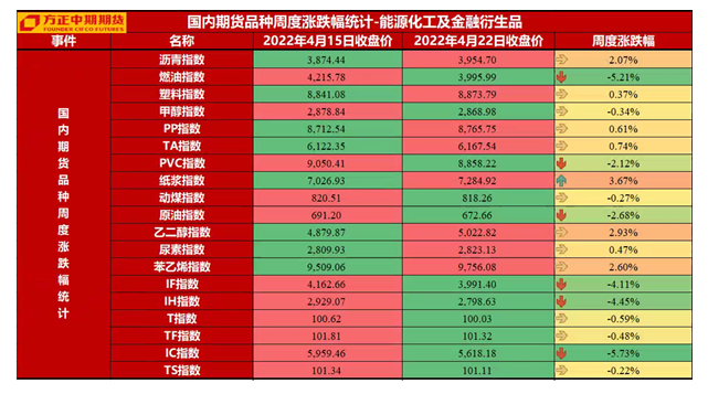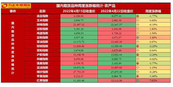 生鲜软商品板块:本周生鲜果品走势分化,红枣表现强势,苹果表现弱势。苹果市场来看,产区陆续进入花期,天气波动平稳,炒作预期降温,期价继续高位回落;红枣市场来看,成本支撑凸显,期价低位回升。后期来看,苹果现货价格与新果产量预期依然是市场主要关注点,期价继续下行空间或有限;红枣市场来看,供应偏紧支撑仍在,期价存在向上修正的基础。本周软商品走势也有所分化,橡胶继续探底,纸浆延续强势,白糖和棉花震荡整理。橡胶市场来看,需求端疲弱继续施压,期价继续探底;纸浆市场来看,供应扰动仍在,叠加人民币贬值引发成本上移,期价高位偏强;白糖市场来看,国内进入产糖尾声,同时消费进入淡季,期价继续窄幅震荡;棉花市场来看,成本与消费的博弈延续,期价偏强震荡。后期来看,供应端相对支撑仍在,纸浆期价或延续高位区间波动;棉花市场成本与消费的博弈延续,期价继续区间震荡;白糖面临供给季节性下滑与需求淡季的博弈,期价预期区间震荡;橡胶市场需关注疫情的变化,后期疫情逐步好转,消费存在修复预期,期价或探底回升。