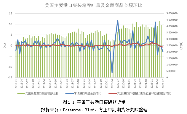 美国是全球最大的进口贸易国,尤其中低端制造业更是严重依赖进口,进口商品中九成以上采用集装箱运输。随着美国经济陷入技术性衰退期以及美联储持续加息,美国消费边际增速放缓,美国各大零售进口商对美国消费预期并不乐观,近期大幅削减零售订单。沃尔玛取消数十亿订单,塔吉特取消超15亿美元订单,以便使库存水平与预期需求保持一致。美国进口货量在今年5月触顶之后,连续下降两个月。今年7月美国主要港口集装箱吞吐量录得371万TEU,同比下降7.1%,环比下降10%。同时,美国进口商品价格指数指数(剔除石油和石油制品)在5-7月连续三个月环比负增长。在量价齐跌的情况下,美国季调进口商品金额在6-7月连续两个月环比下降。美国零售联合会(NRF)下调了今年7-12月美国需求预测,预计抵达美国大型港口的零售货物总量约1280万TEU,同比下降1.5%。