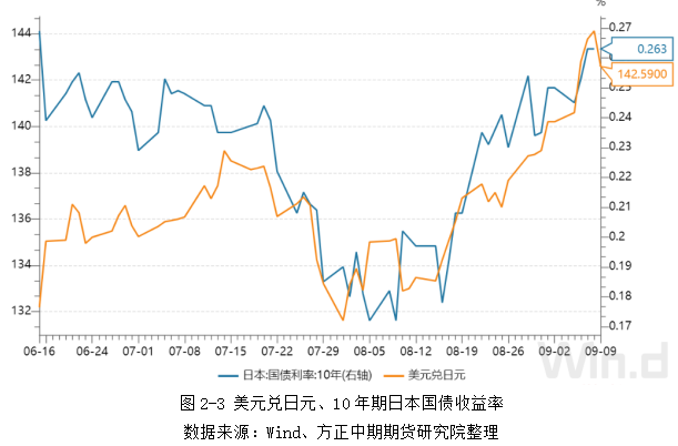 不过,随着欧美国债收益率不断攀升的带动下,以及日本CPI数据出现反弹致日本央行加息升温,日本国债收益率从8月中旬起再度反弹。同时,虽然美国通胀数据有所回落,但是美联储各大官员依然释放鹰派讯号,尤其鲍威尔在全球央行年会强调“先抗通胀、后救经济”的政策,使得美元指兑其他货币汇率持续攀升。9月8日美元兑日元汇率收盘价录得144.12,创近24年以来新高;10年期国债收益率达到0.263%,创近3个月以来新高。