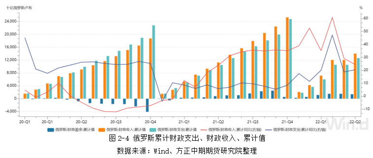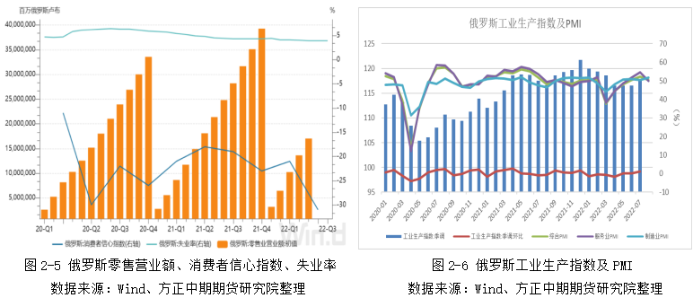 今年1-6月俄罗斯累计财政盈余达到1.38万亿卢布,同比上涨78.7%。其中,财政支出为12.63万亿,同比上涨20.4%;财政收入为14.02万亿,同比上涨24.4%。据悉,自俄乌冲突爆发以来,俄罗斯每天军费开支达到3亿美元,导致财政支出大幅攀升。不过,俄罗斯是资源出口导向型国家,随着石油、天然气、煤炭、粮食等大宗商品价格的飙升,使得俄罗斯获得额外的财政收入。总体来看,俄罗斯财政收入增幅大于财政支出,财政盈余同比大幅增长。同时,西方对俄罗斯的技术和设备制裁正迫使俄罗斯扶持自身产业,在经济领域逐渐实现自给自足。国内工业在1-4月持续萎缩之后,终于在5-6月探底,7月工业指数录得117.9,环比上升1.2%。制造业从5月起恢复至荣枯线以上,8月制造业PMI录得51.7,创俄乌冲突爆发以来新高。零售业营业额相比去年同期有14.3%的增长,不过二季度消费者信心指数回落至-31,创2009下半年以来新低。服务业PMI在8月重新回落至荣枯线以下。随着工业和服务业的整体复苏,俄罗斯5-7月失业率均维持在3.9%,创1994年以来新低。
