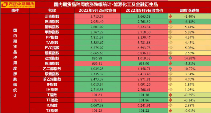 石油化工板块:本周石油化工板块走势有所分化,原油、低高硫燃料油、沥青、LPG能源品种走势均呈不同程度下滑,聚酯板块以及塑料相关品种价格均出现不同幅度上涨。后市来看,我们认为能源品种与国内化工品种走势可能继续呈分化走势,能源品种始终在美联储货币政策利空压力以及自身供需低估值下博弈明显,重点关注节奏变化,而聚酯板块以及塑料等化工品种受益于金九银十预期下,价格有望继续呈反弹走势,但反弹高度需谨慎看待,重点关注需求持续性进展。