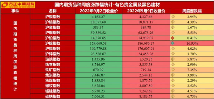 有色金属板块:【有色金属】本周有色金属普现反弹,镍涨幅居前。宏观面利空因素有所消化,欧洲央行加息控通胀意愿较为坚决,美元指数冲高回落调整,而国内CPI、PPI数据则给国内信贷宽松和刺激措施继续带来空间,盘后看社融数据好于预期,国内金九银十需求预期料有提振。而海外有色金属因能源等因素供给端扰动继续存在,在宏观压力缓解后向上波动弹性较强,且阶段可能延续内强外弱。铜:从基本面来看,随着气温的下降,前期限电对基本面的影响已经逐步消退,铜上下游开工均有所改善,从调研情况来看,受限电扰动的冶炼产能已经完全恢复,九月冶炼产量将在加工费继续抬升的刺激下有望冲击90万吨;而进入九月是铜“金九银十”消费旺季,目前电力建设景气度较高,市场对消费仍存良好预期。后市来看,铜价在宏观不确定仍存和基本面供需边际走强下回归震荡行情,区间64500-58000,建议期货观望,期权买入虚值看跌期权对敞口进行保护。锌:基本面方面,因俄罗斯将北溪1号无限期关闭,引发市场对于能源紧缺的忧虑,欧洲天然气大幅上涨,令海外锌冶炼减产的预期再度升温。而国内方面,随着全国电力供应的恢复,限电对基本面的影响已经消退,而接下来进入金九银十消费旺季,加之国家对基建的支持也在持续加码,预计在低库存之下支撑锌价。鉴于当前宏观面和基本面均有所好转,预计短期锌价料震荡偏强,期货考虑回调买入,期权卖出虚值看跌赚取期权费。铝:供给方面,四川因限电而停产的产能预计9月将陆续复产,但从复产到达产还需要1-2个月时间。另外,市场有传闻称云南或因水电不足而压减省内电解铝产能20-30%负荷。如果属实,将对铝价形成较强提振。需求方面,传统淡季过去之后将迎来“金九银十”的需求旺季,但是近期下游开工情况来看,增长相对缓慢。进出口方面,由于近期沪伦比值有所回升,进口窗口有一定开启预期。由于近期沪伦比值有所回升,进口窗口有一定开启预期,同样对于出口方面来说较为不利。另外国外需求较差也造成了出口型企业订单数量减少。库存方面,国内交易所库存低位小幅反弹,而社会库存基本维持低位横盘震荡,国外伦铝库存则出现了长期跌势止跌企稳,且有小幅反弹的局面,对伦铝价格形成利空影响。整体上看,目前沪铝盘面受宏观以及减产传闻影响波动较为剧烈,建议短期多单持有,可以考虑跨期套利策略,空近月多远月。主力合约上方压力位20000,下方支撑位17000。期权方面,建议可以卖出深度虚值期权以赚取额外权利金收益。镍:从供给来看,8月电解镍产量环比小幅回落,9月略回升,进口窗口仍有望打开,镍生铁国内减产,近期成交价稳定回升。LME震荡去库存延续,保税区镍豆库存也有下降,阶段需求好转。需求端来看,限电缓解不锈钢下游加工逐渐有所恢复,持续去库存,需求好转,价格回升。新能源动力电池对硫酸镍需求回升,镍豆溶解一度有利润。镍2210升至19万元附近,短线偏强,节后关注宏观及下游共振变化,短多长空思路。锡:供给方面,此前6月集中检修的精炼锡产能在7-8月已经全面复产,进口盈利窗口也有所开启,总体来看将呈现逐渐宽松的态势。需求方面,光伏行业保持高增速,锡焊料企业出口订单减少,且国内淡季效应显现,下降幅度超市场预期。铅蓄电池产量持续走高。库存方面,SMM社会库存环比去库,技术上,盘面破位下行,跌破170000后又反弹至180000附近,宏观对盘面指引较强,中长期看下行趋势未尽。铅:随高温天气减少,各地限电影响缓和,如安徽等地区限电结束,供需同步恢复,但偏重于供应增量;同时近期沪伦比值利于进口,铅精矿进口货源增加,部分地区铅精矿加工费出现上涨的情况。近期社会库存也因供应增长出现回升,供应增量及原料价格松动,使得铅价继续表现承压。铅主力合约继续在震荡区14700-15300以内波动为主,15000以下短线震荡走弱延续。后续关注库存变化。