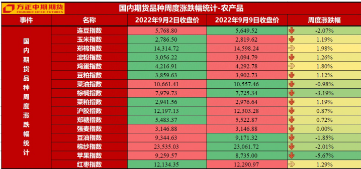 生鲜软商品板块:本周生鲜果品走势分化,红枣窄幅震荡,苹果高位回落。苹果基本面情况来看,早熟苹果价格大幅回落给盘面带来压力,期价跟随大幅回落,不过减产形成的支撑仍在,期价继续下行空间有限;红枣市场来看,中秋节备货结束,仓单压力与成本的博弈延续,期价进入窄幅震荡。后期来看,生鲜果品市场趋势性驱动因子有限,期价整体仍然维持区间波动判断。本周软商品多数呈现窄幅震荡走势,只有纸浆表现为偏强。纸浆市场来看,进口量维持低位,供应偏紧预期提振期价;橡胶市场来看,现货库存偏低与需求弱势的博弈延续,期价窄幅震荡;白糖市场来看,工业库存压力仍在,期价表现承压;棉花市场来看,成本与消费博弈延续,期价窄幅震荡。后期来看,软商品板块弱势品种橡胶、白糖、棉花承压因素仍在,期价或继续偏弱波动,纸浆来看,需求端表现承压,或限制期价上行空间。