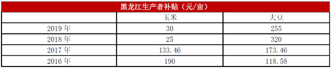 表1:黑龙江玉米、大豆生产者补贴