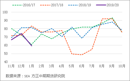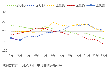 根据以往数据的统计,国内豆油的库存往往要进入4-5月以后,在南美大豆大量到港后才会开始堆积。而目前油厂库存的快速攀升,一方面是因为交通运输受阻导致出货量减少;另一方面则是餐饮业大面积停工导致的需求减少。我们预期在5月之前国内餐饮业很难恢复到疫情发生前的状态,因此未来2个月国内豆油库存量仍将不断升高,这将抑制国内整体植物油的价格。由于豆油库存的累积,这也会使得国内对棕榈油的进口依赖减少,从而使得马来棕榈油出口量可能再度下滑。