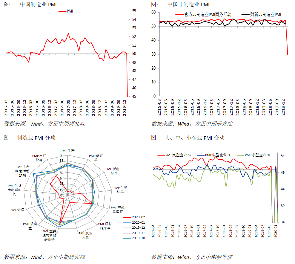 综合来看,生产、新订单均大幅下滑,表明实体经济受到疫情影响供需两弱。在手订单和经营预期的走低,显示生产者对于后期看法仍偏悲观。我们此前曾提示,1月数据尚未受到公卫事件影响,2月数据则开始体现这一影响,表现符合我们的预期。从3月开始部分行业已经开始逐步复工,PMI和主要分项将出现部分修复。但整体库存周期受到扰动的幅度较大,且应对公卫事件的控制措施短期内仍无法放开,因此实体经济的修复或呈现小幅度长周期特性。预计中性状况下,年中前后库存才能重新回归正轨。且不同行业可能差异较大,服务业将受到更严重、更长期的影响。