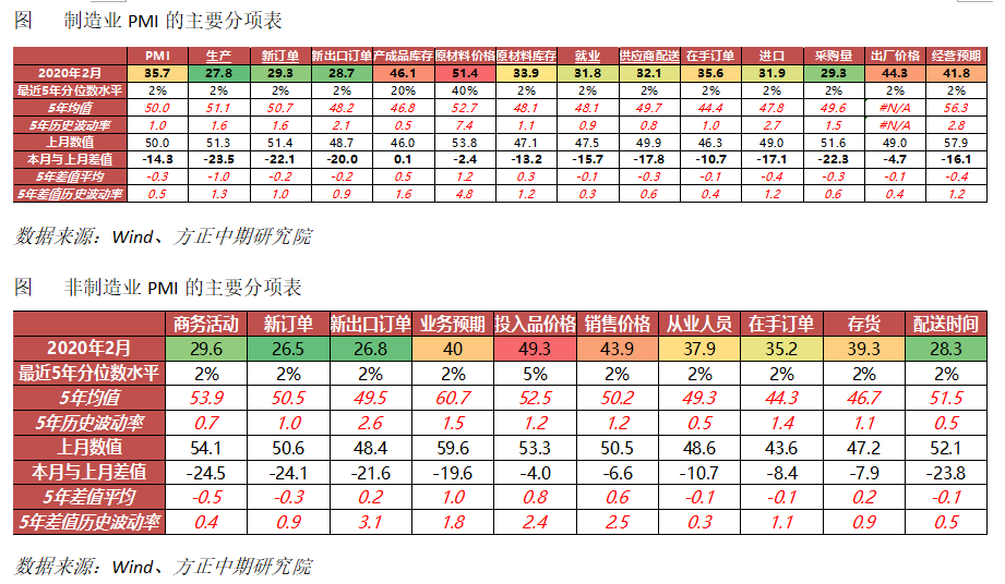 2月29日,中国官方制造业PMI公布,2月中国官方制造业PMI报35.7,明显低于预期的46,也显著低于前值50;2月中国官方非制造业PMI报29.6,显著低于预期的50.5,也低于前值54.1。2月中国官方综合PMI报28.9,较前值53明显回落。在制造业PMI总指数的影响因素中,生产、新订单、原材料库存、就业分项分别拖累总指数下降5.88、6.63、1.32、3.14、2.67,供应商配送拉动总指数上升2.67。