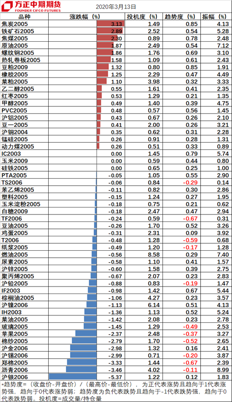 外汇方面,美元方面,特朗普周五将宣布全国进入紧急状态,采取积极的财政政策应对公卫事件,市场流动性短缺,美元需求大增,均助力美元,美元指数上涨1%至98.42。财政政策刺激美元上涨,符合我们预期,但是难以根本改变美元疲弱态势,降息及降息预期使得美元承压,美元上行趋势难以持久,适合逢高做空。英镑方面,英国疫情防控措施让市场失望,叠加美元上涨使得英镑承压,英镑兑美元大跌2.34%至1.2277。英国经济陷入停滞,有衰退的迹象,英镑长期会偏弱运行,大跌后可能会小幅回调,故可逢高做空。随着股市和美国收益率反弹,市场恐慌情绪有所缓解,美元兑日元涨2.81%至107.58;一度涨3.7%至108.50;短期内,日元或小幅回调,但长期依然看涨日元等避险货币资产。欧元方面,投资者对欧洲央行的刺激措施不以为然,疫情在欧洲开始大爆发,投资者纷纷抛售欧洲资产,欧元兑美元跌0.7%,报1.1107。欧元兑可能在1.0980/1.1380范围内剧烈震动,建议逢高做空。